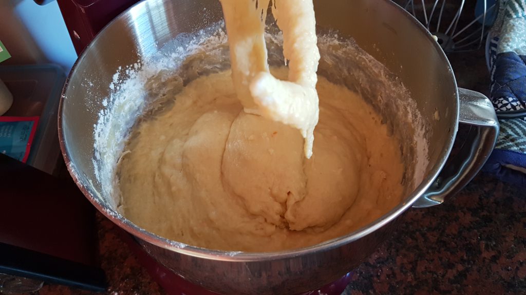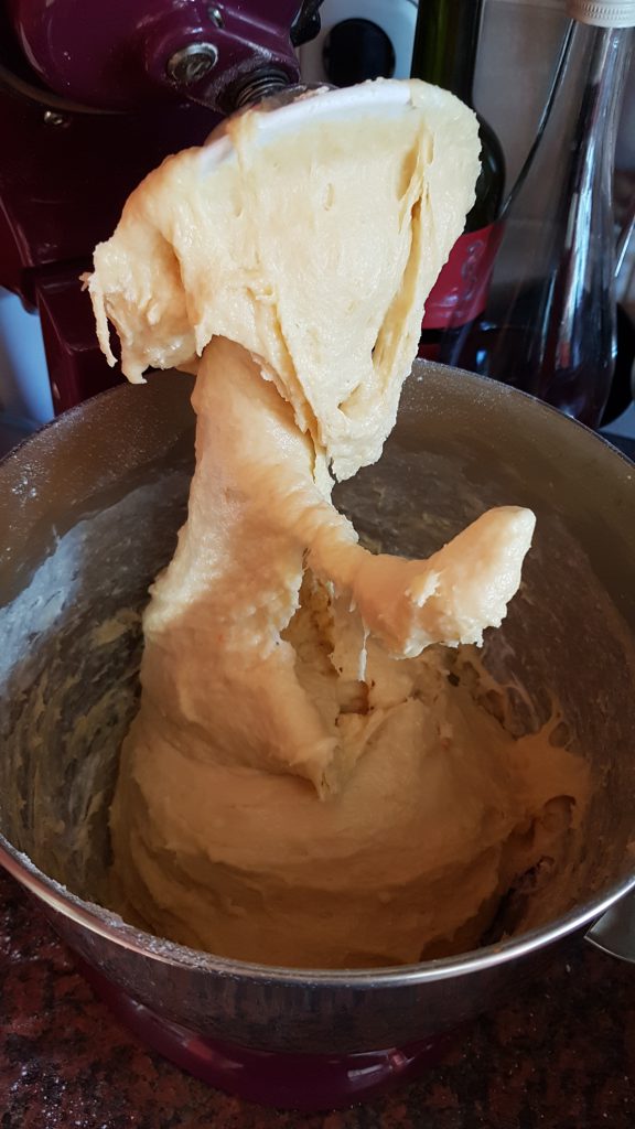 Das Mehl in die Küchenmaschine geben und mit dem Salz vermengen, dann Milchmischung, Eier und den Abrieb von etwa einer 1/4 Orange hinzu geben und mit dem Knethaken vermengen. Meine Maschine brauchte ein bisschen Hilfe, um das ganze Mehl zu fassen zu bekommen.