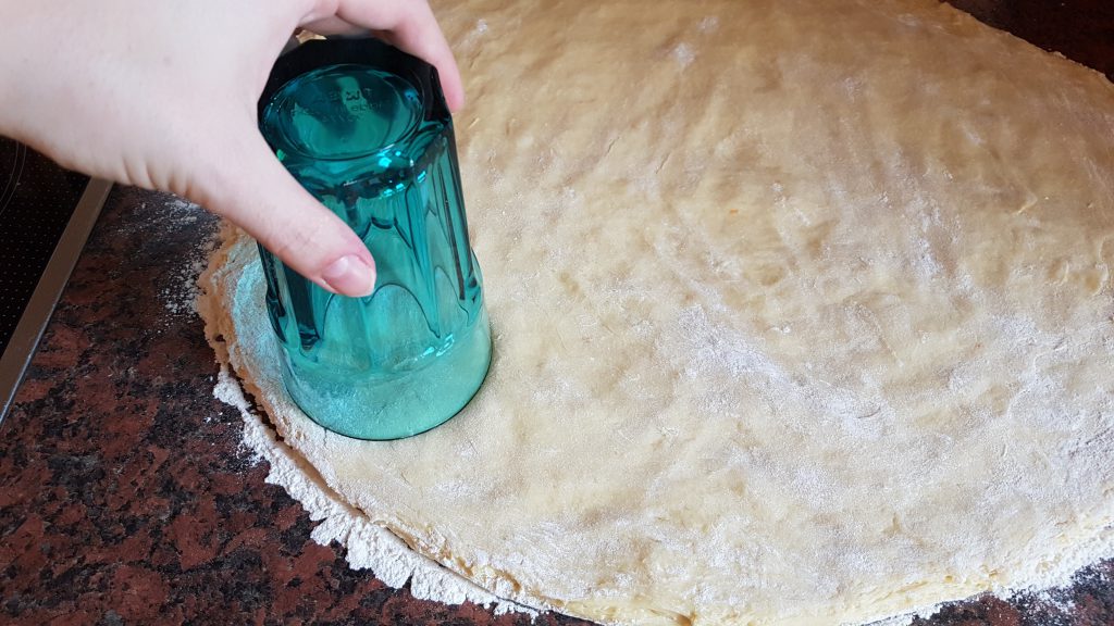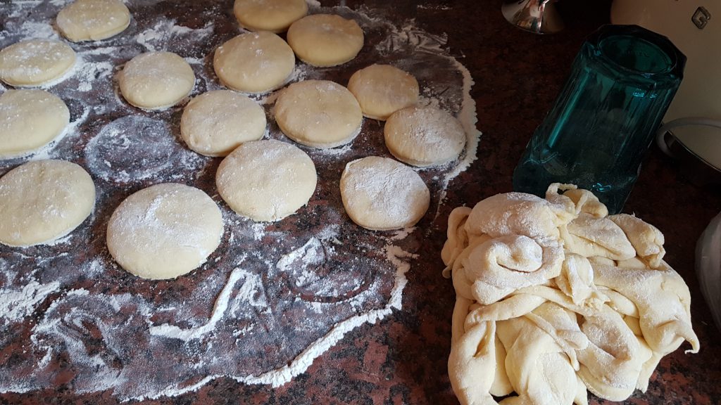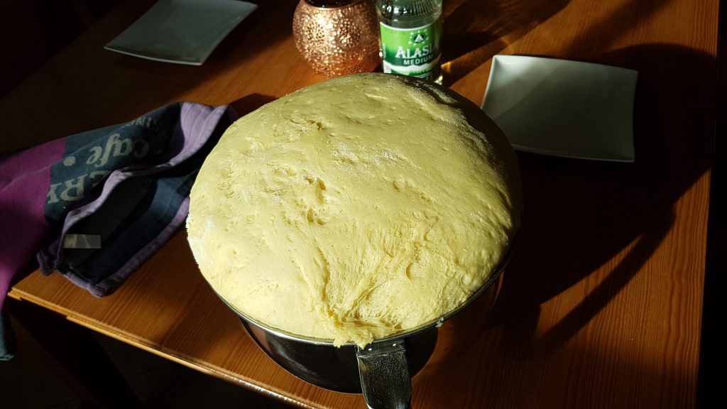 Nach dem Aufgehen hat er sein etwa verdoppelt. Jetzt muss die Arbeitsfläche ordentlich gemehlt werden, dann kann der Teig vorsichtig aus der Schüssel auf die Fläche gebracht werden. Jetzt sollte er sich anfühlen wie eine junge Brust, wurde mir mal gesagt. Den Teig nun möglichst ohne die Luftblasen zu entfernen etwas flacher drücken auf circa 2-3 Zentimeter Dicke. Dann mit einem Glas Kreise ausstechen, den Restteig vorsichtig wieder homogen kneten und weiter ausstechen.