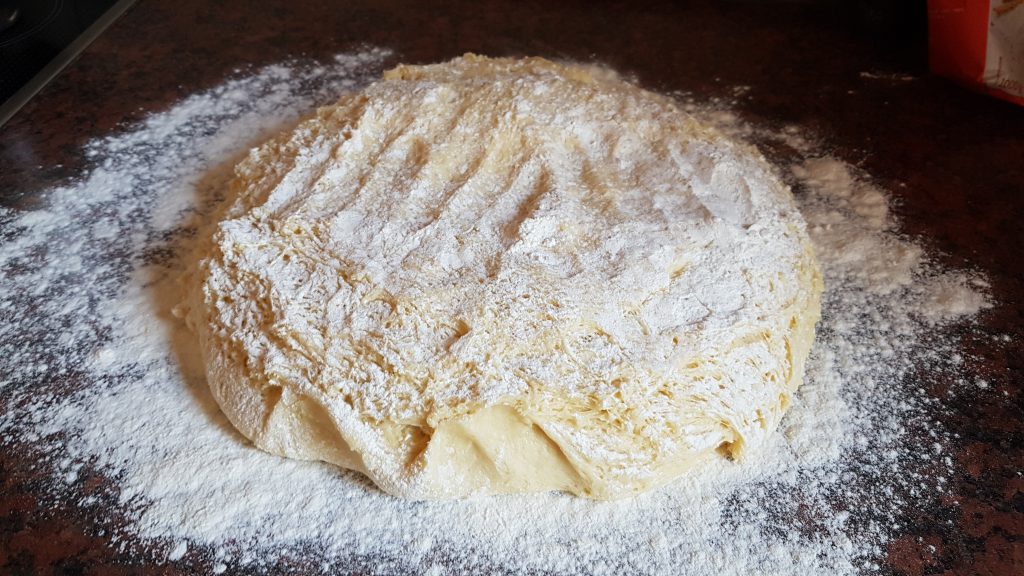 Jetzt kommt der etwas knifflige Teil, denn man muss abschätzen, wie viel zusätzliches Mehl der Teig braucht, bis er die richtige Konsistenz hat. Bei mir hat es schon noch einiges gebraucht, der Teig war zwar immer noch pappig, aber es genug Festigkeit hatte. Ist die gewünschte Konsistenz erreicht, wird die Schüssel mit einem frischen Handtuch abgedeckt und 30 Minuten an einem warmen Ort gehen gelassen.