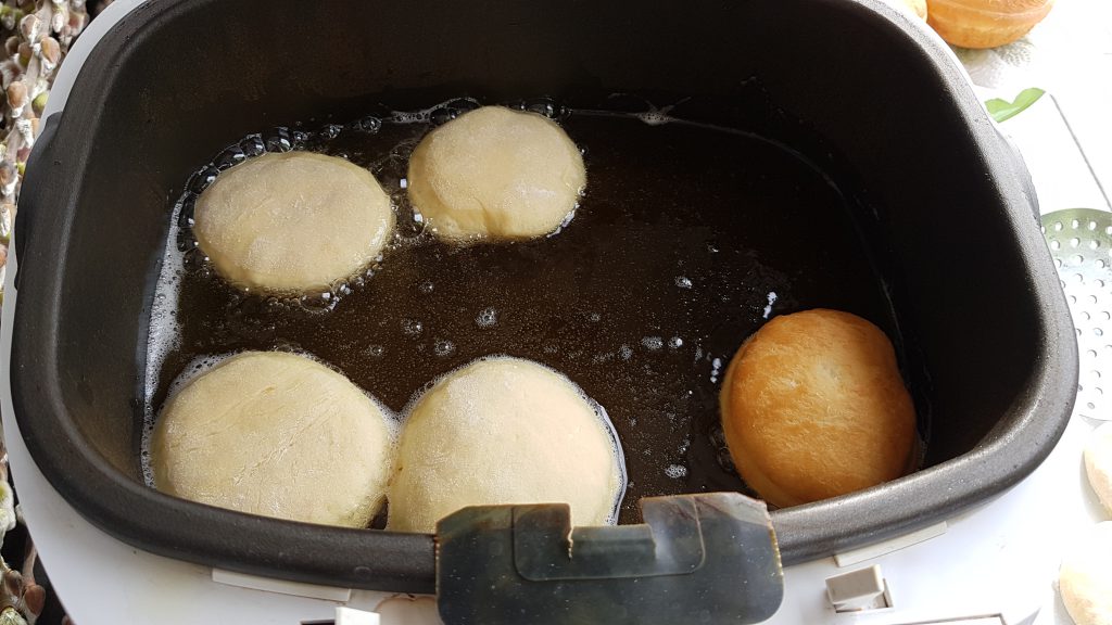 Die noch fluffigen Teiglinge aus der ersten Ausstech-Runde können direkt frittiert werden, die späteren etwas entlüfteten habe ich noch mal ein bisschen gehen lassen.