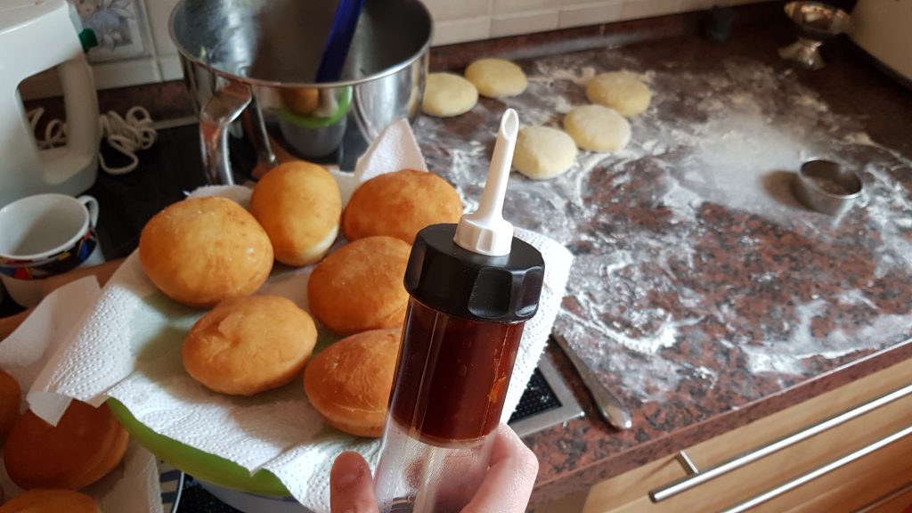 Meine größten Fallhürden sind immer die Menge des Mehls bis der Teig die richtige Konsistens hat und die Hitze des Frittierfetts. Außerdem kann es beim Befüllen passieren, dass sie an einer Stelle aufbrechen, wenn die Füllung zu nah am oberen oder unteren Rand landet. Jetzt aber erstmal zu den benötigten Utensilien, bevor es an das Rezept selbst geht. Auf jeden Fall braucht man eine Art von Spritz Apparat, entweder man versucht es mit einem Spritzbeutel oder gleich mit einer überdimensionalen Spritze zum Befüllen von Gebäck. Mit einem langen, dünnen Aufsatz kommt man dann auch bis in die Mitte des Krapfens. Eine Fritteuse ist auch empfehlenswert, auch wenn man es zur Not in einem Topf machen könnte. Die Temperatur sollte aber konstant auf 160-170°C gehalten werden können, wenn die Fritteuse oder der Topf das nicht anzeigt, braucht es noch ein Thermometer. Zu guter Letzt ist eine Küchenmaschine sehr praktisch, außerdem braucht es Messbecher, Waage und eine feine Reibe.