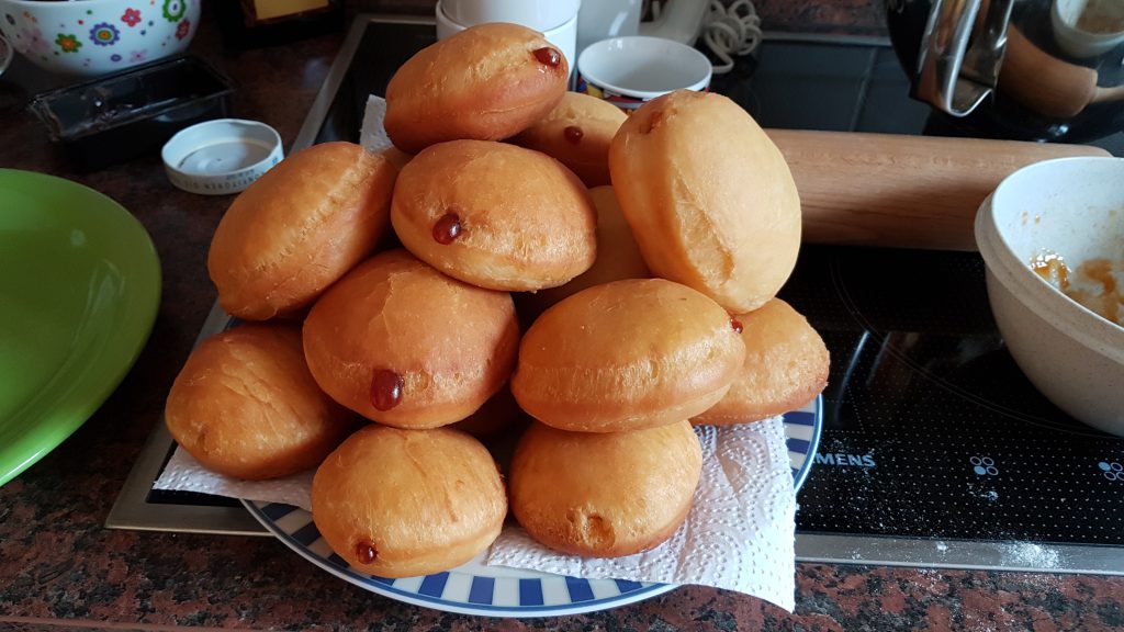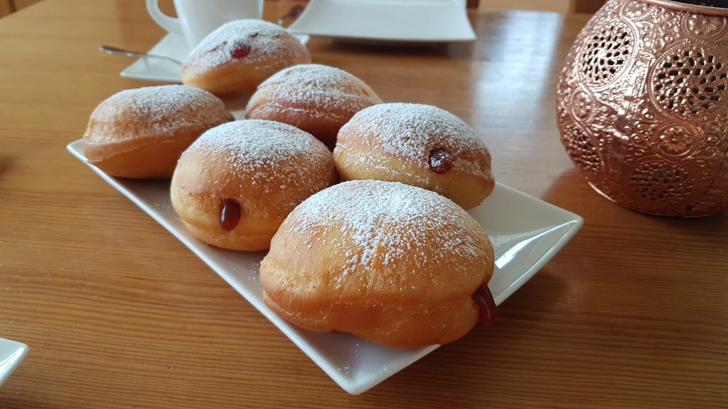 Faschingszeit hat einen großen Pluspunkt: es gibt überall Krapfen! Für mich und meine Familie ist aber eines ganz klar: wenn die mit Marmelade gefüllt sind, dann nur mit Hiffenmark! (=Marmelade aud Hagebutten) Auch wenn ich selbst auch Füllungen aus Vanillecreme oder Schoko-Nougat sehr zu schätzen weiß. Leider schmecken nicht jedes Bäckers Krapfen gut und bei uns ist es quasi Tradition, wenigstens einmal in der Faschingszeit Krapfen selbst zu backen. Das birgt zwar viele Tücken, aber ich habe mittlerweile einige gute Tipps von einem Koch in der Familie bekommen, die sie etwas gelingsicherer machen. Für wen es das erste Mal ist, der sollte vielleicht besser mit einer kleineren Menge starten, denn selbstgebackene Krapfen sollten möglichst noch am selben Tag genossen werden!
