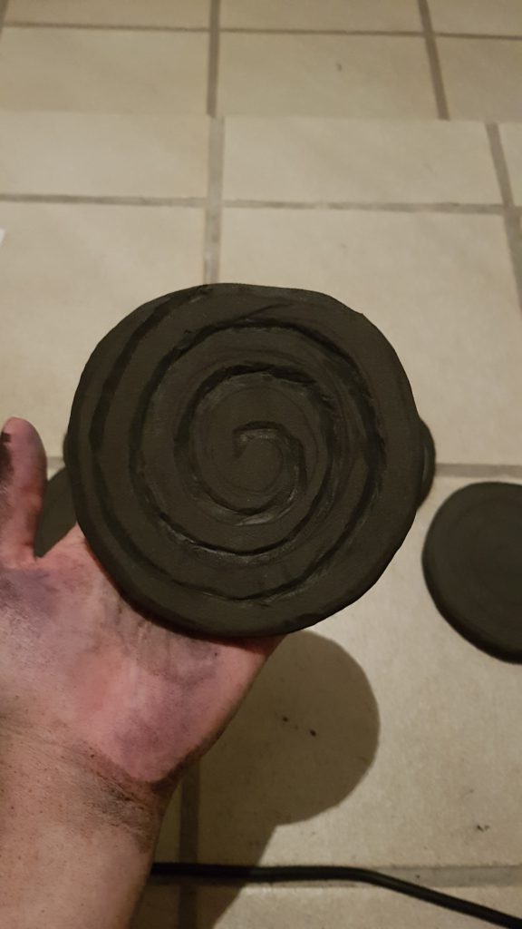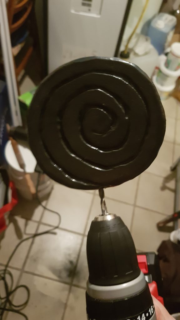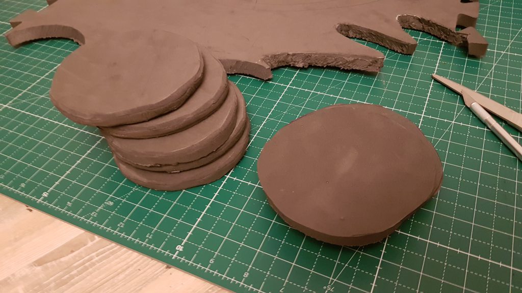 Meine Idee war also, selbst wenn die Lollis schief gehen würden, hatte ich zumindest ein bisschen Übung. Ich habe also erst einmal einen Kreis auf Papier gezeichnet, damit alles halbwegs die gleiche Größe haben würde, und diesen dann mithilfe eines Kullis 7 mal auf die Matten übertragen. Weil ich Material und Platz sparen wollte, sind die Kreise nicht perfekt geworden, aber das Dremeln hat die meisten Unebenheiten entfernt. Die Kreise habe ich im Anschluss mit einem Cuttermesser oder einem scharfen Skalpell ausgeschnitten, wobei man sich Mühe geben sollte, im 90° Winkel zu schneiden. Das ist schwerer als ich dachte, aber solange nur eine Seite relevant ist und nichts übereinander geklebt werden muss, sind kleine Fehler verkraftbar. Die Kreise wurden dann einmal ringsherum mit dem Dremel bearbeitet (auf angemessene Schutzkleidung achten! Schutzbrille, Mundschutz). Dazu habe ich einen Schleifaufsatz verwendet und zuerst die Schnittkante selbst, dann die Ecken rechts und links dieser Kante geglättet und abgerundet. Den Dremel dabei auf einen zu bewegen und lieber an etwas übrig gebliebenem EVA üben, wenn es der erste Versuch sein sollte. Meine Geschwindigkeit lag bei etwa 10.000 Umdrehungen, wenn ich mich richtig erinnere.