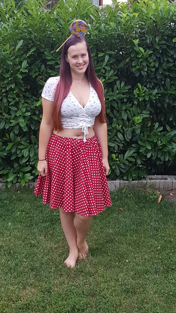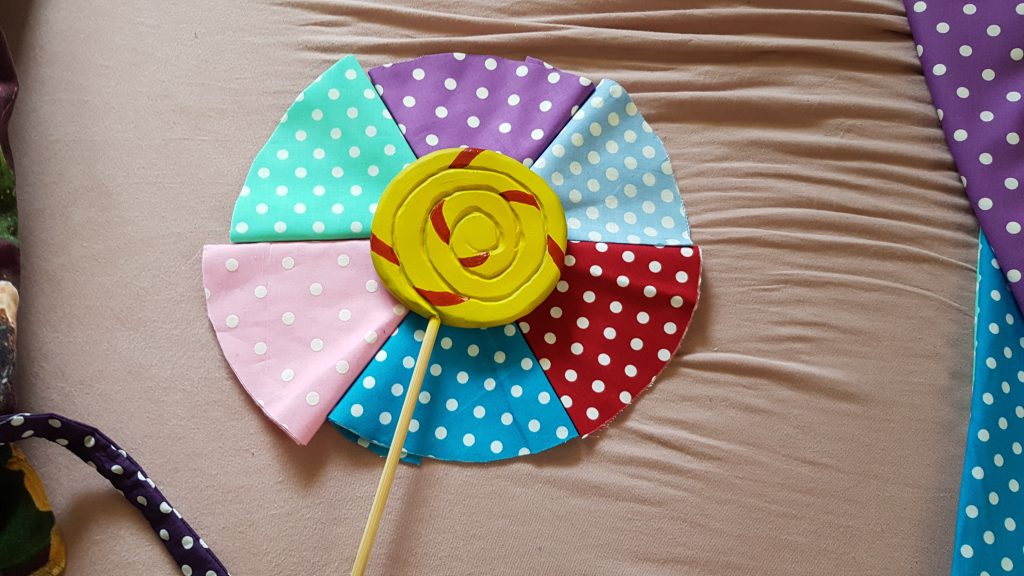 Schon einige Proben davor stand fest, dass wir eine kleine Choreografie dazu erstellen wollten, und kurzfristig entschieden wir uns auch für ein zusammenpassendes Outfit. Neben ziemlich niedlichen Polka Dot Röcken in gut zusammen passenden Farben fand ich die Idee von echten Lollis sehr gut. Schon ein paar Wochen davor hatte ich mir Gedanken darüber gemacht, wie weit wir Outfits in die optische Richtung “Süßigkeiten” bringen könnten, ohne dass es übertrieben aussähe. Und zu viel Arbeit machte. Das war auch der Grund, weshalb ich mich gegen Lolli-artige Swirls auf den Röcken selbst entschieden hatte. Aber warum nicht einen ganzen Lolli für jeden basteln?