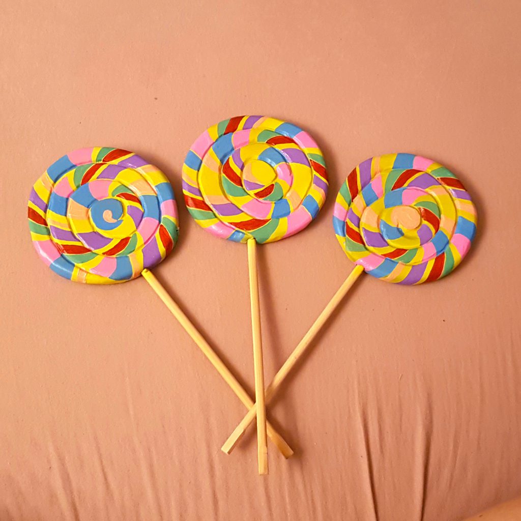 Nach zwei Schichten Flexbond folgen jeweils eine Schicht weiße und gelbe Airbrush Farbe (hier hat sich der Stiel als besonders hilfreich erwiesen!), anschließend habe ich versucht, die Farben unserer Röcke in die farbigen Swirls der Lollis zu integrieren. Hierbei ist der Kreativität keine Grenze gesetzt und es gibt genügend Inspiration im Internet. Die Stile könnte man jetzt entweder Holzfarben belassen oder weiß anmalen. Zu guter Letzt noch alles mit einem Klarlack fixieren und fertig!