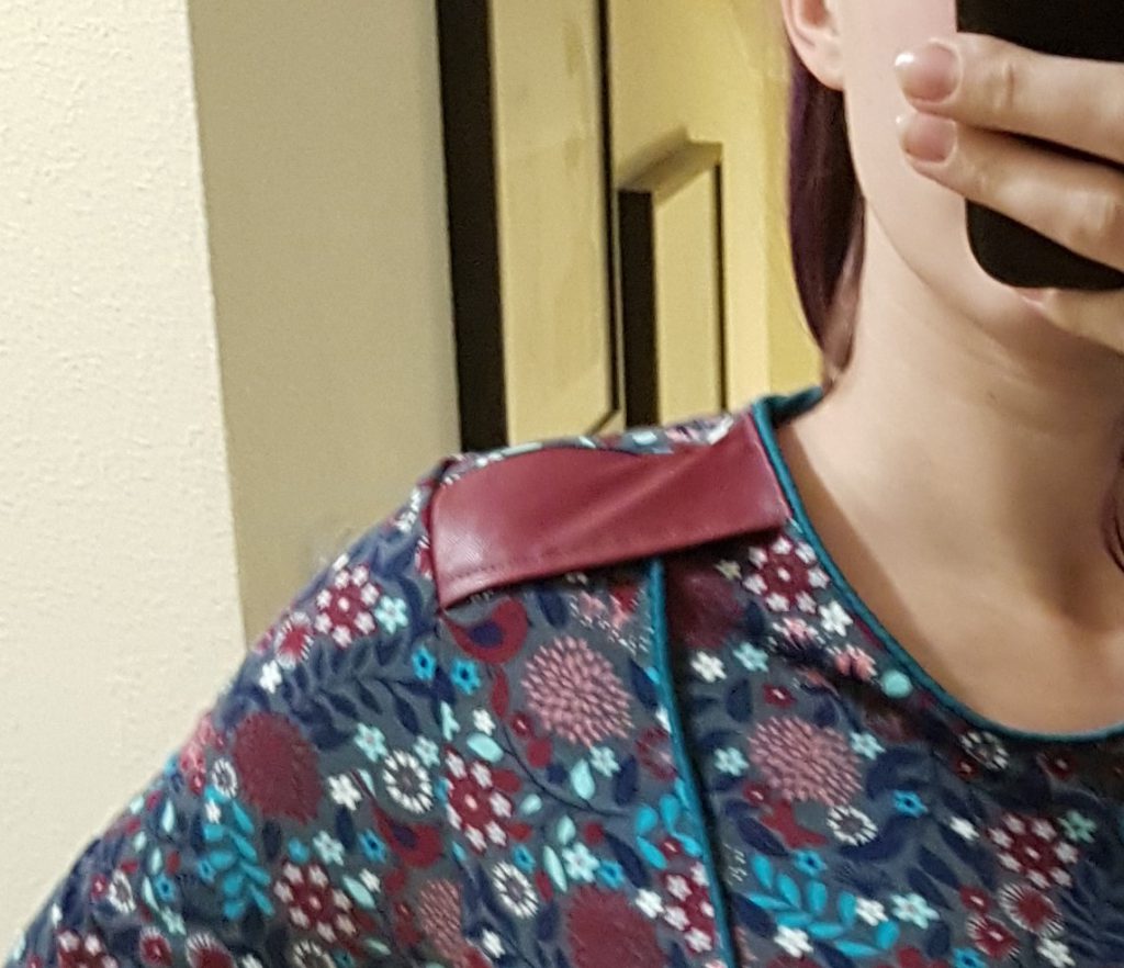 Es folgte nun das erste Kunstleder Detail entlang der Schulter, das an der später sichtbaren Seite einmal umgenäht wurde. Trotz des extra dafür eingesetzten Teflon Füßchens und größerer Stichlänge, war dieses Kunstleder nicht allzu angenehm zu vernähen. Die genau entgegengesetzte Kante wurde nun an der Schulter links auf rechts auf das Vorderteil gelegt und darauf kam mit der rechten Seite nach Unten das Rückenteil. Hier traute ich mich dann doch wieder an die Overlock, die die Kanten gleich versäuberte. Das Rückenteil bekam außerdem noch die im Schnittmuster enthaltenen Abnäher. Im Nachhinein hätte ich jetzt besser eine andere Reihenfolge gewählt, allerdings schloss ich jetzt zuerst die Seitennähte und setzte den fertig genähten Ärmel im Anschluss ein. Leichter wäre vor allem mit der Overlock gewesen, den noch offenen Ärmel in das vorgesehene Armloch bei noch offenen Seitennähten einzufügen.