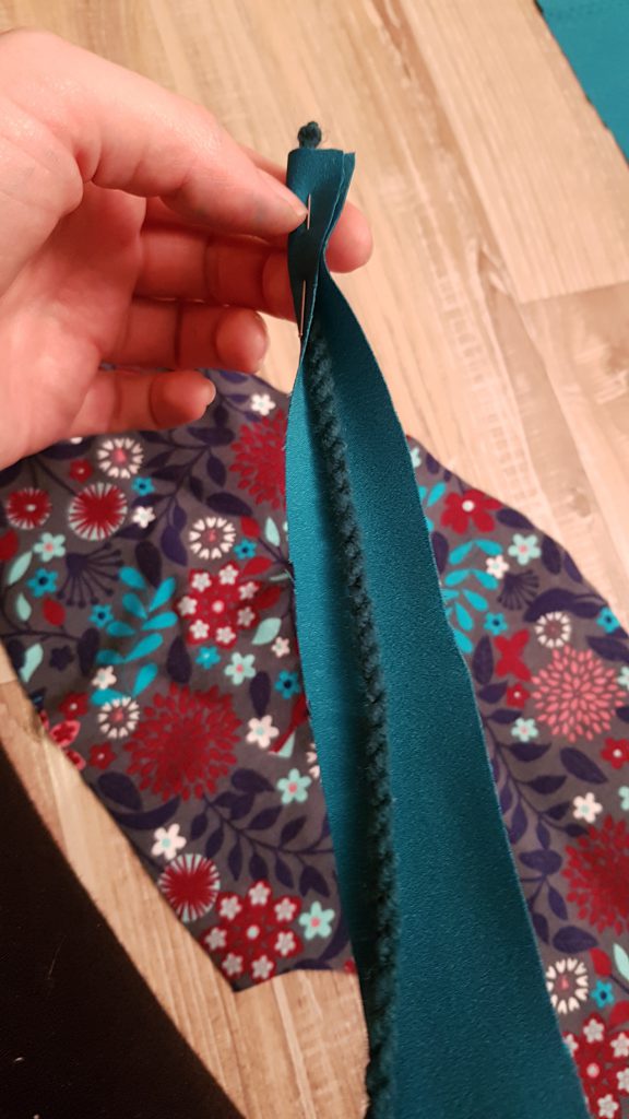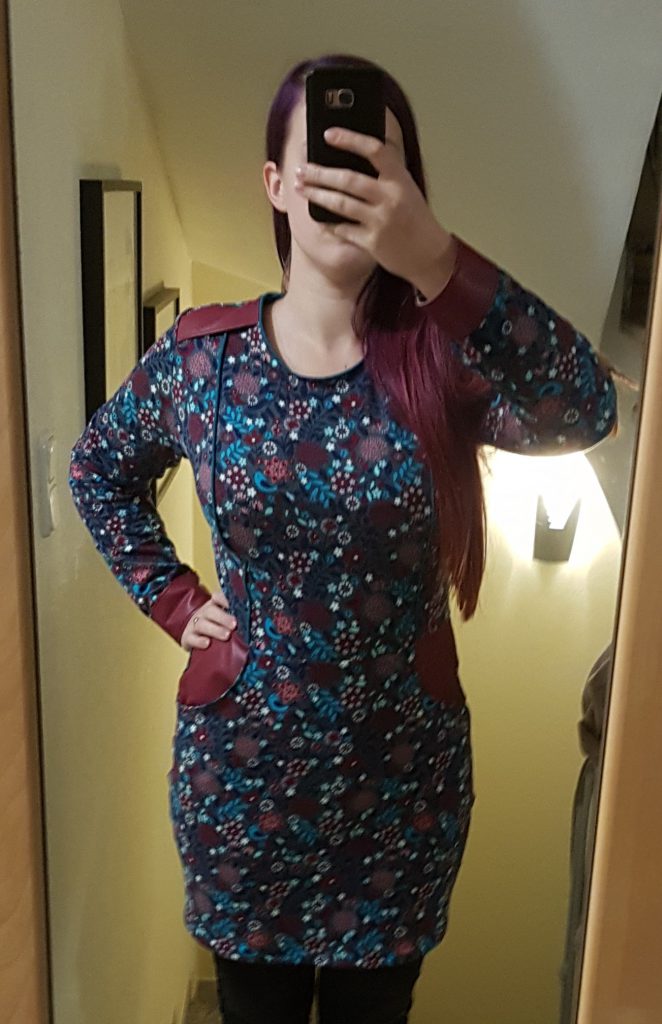 Wie ich es besser gemacht hätte: nur den Ärmel schließen, ohne das Kunstleder angenäht zu haben, dieses separat zu einem Ring schließen und dann den Ring im gleichen Prinzip an den Ärmel nähen. So wäre wenigstens das Kunstleder aus der Overlock Naht draußen gewesen, außerdem wäre somit das ganze mehr wie eine Manschette und würde nicht in der Ärmelnaht festklemmen.