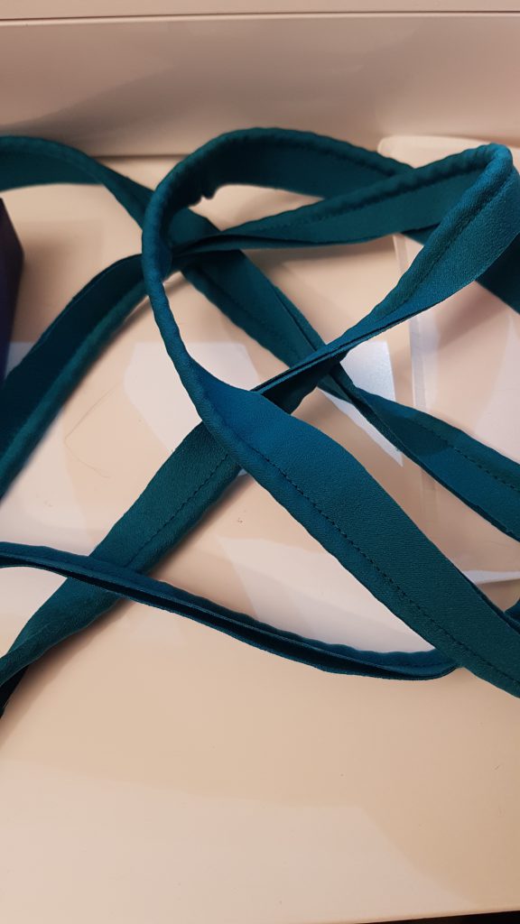 Die letzte Paspel brauchte es noch für den Kragen, wo sie einmal rings herum bündig auf der rechten Seite des Halsausschnittes festgesteckt wurde, wenn möglich mit etwas Zug darauf, und mit der Overlock angebracht wurde. Im Anschluss steppte ich die Nahtzugabe noch einmal von der rechten Seite nach unten fest, sodass sie nicht versehentlich hervor blicken konnte.
